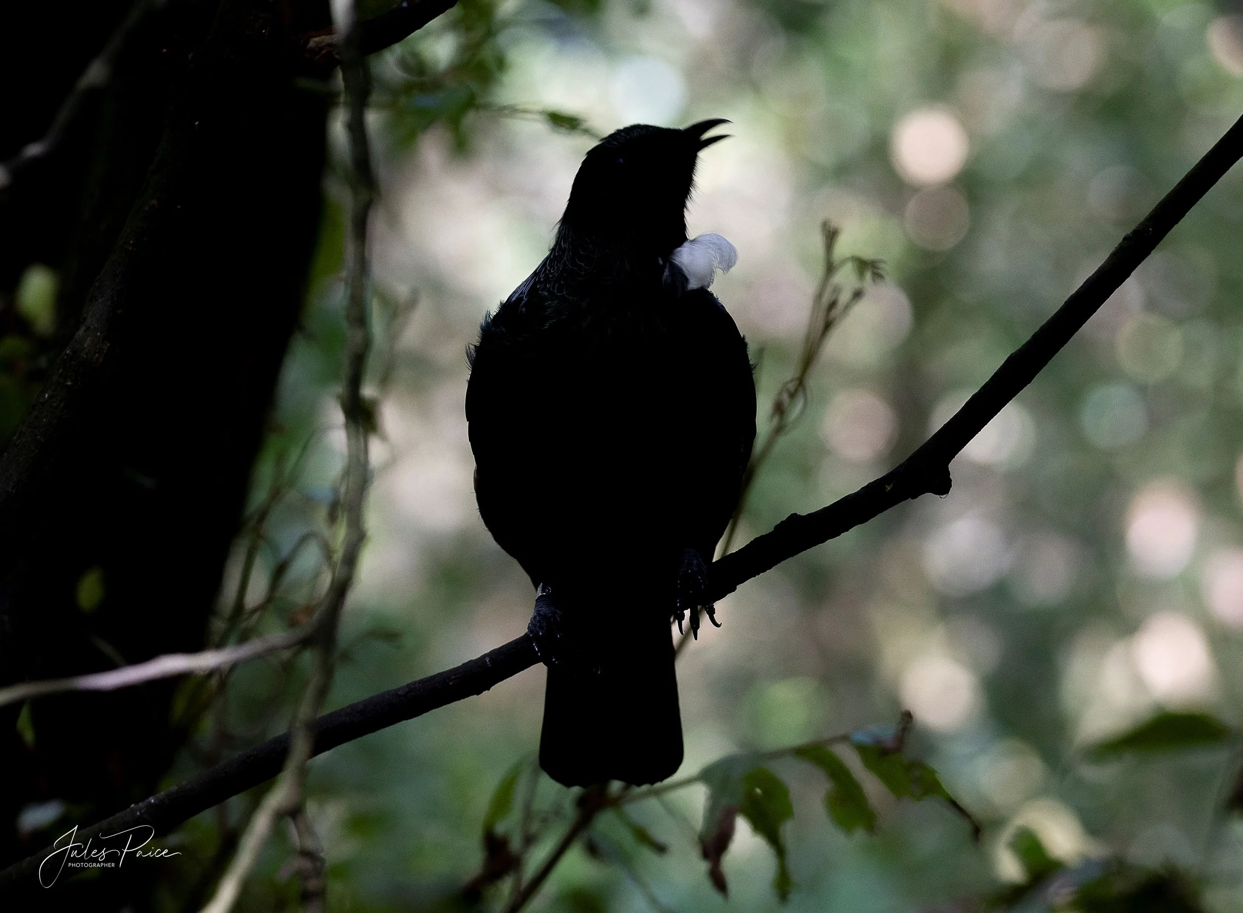 Image 16: One Tui - Tui singing in the bush enclosure, Hamilton Zoo (Direction - Silhouette)