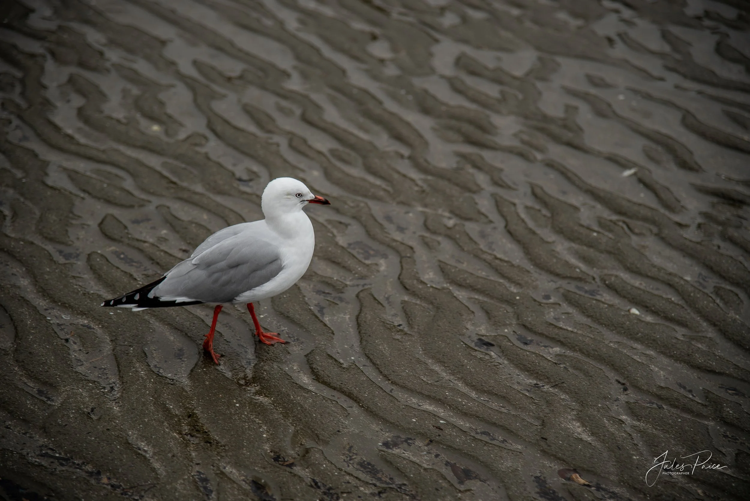 Image 4: Lone Gull - Red billed gull on low tide sand at Waiwera (Composition - Isolate)