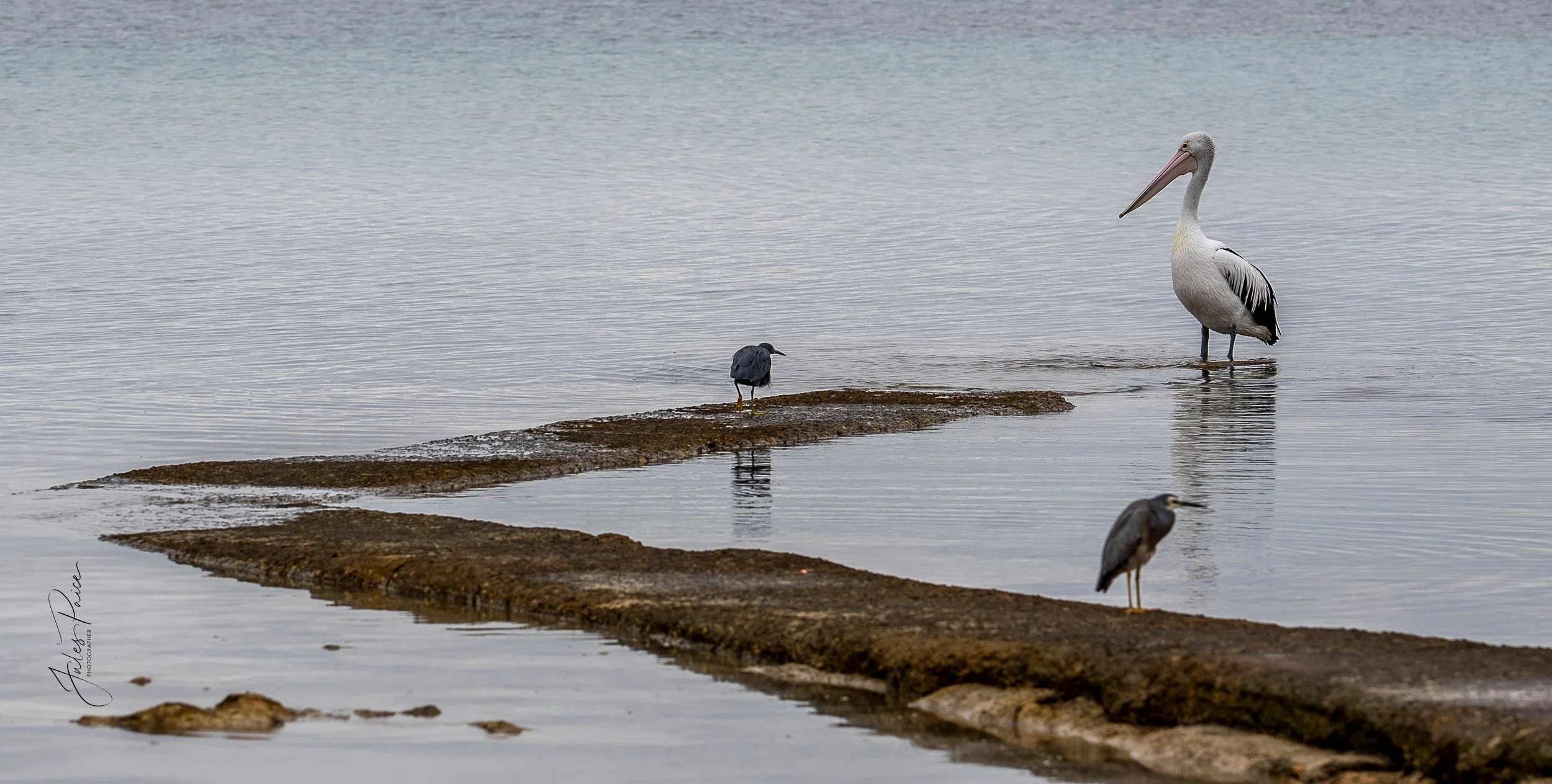 Image 5: Three birds - Pelican, Reef Heron, White Faced Heron, Yorke Peninsula SA (Composition - Leading Lines)